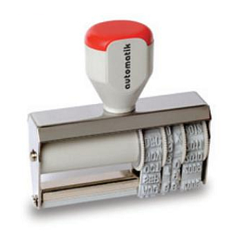 Práctico Timbre Fechador Manual con leyenda predefinidas y bandas de goma intercambiables. Su uso se acompaña de un tampón de tinta para sellos de goma.