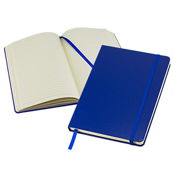 Cuaderno tipo “Colorskine” tamaño A5, con cubierta de cartón piedra forrada en PU (cuero sintético) de color, de 1.5mm de espesor. Interior 80 hojas lineadas amarillas de 80gsm. Incluye banda elástica y huincha separador de hojas al tono. Presentación individual en bolsa de polipropileno.