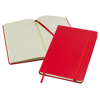 Cuaderno tipo “Colorskine” tamaño A5, con cubierta de cartón piedra forrada en PU (cuero sintético) de color, de 1.5mm de espesor. Interior 80 hojas lineadas amarillas de 80gsm. Incluye banda elástica y huincha separador de hojas al tono. Presentación individual en bolsa de polipropileno.