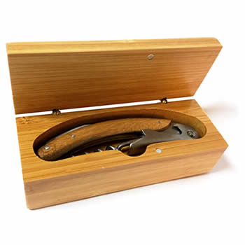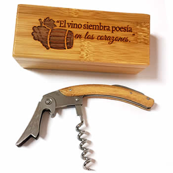 Multiherramienta para abrir vinos, en caja sólida 100% madera Bamboo, con cierre mosquetón envejecido. Incluye descorchador, destapador y abre-sellos.